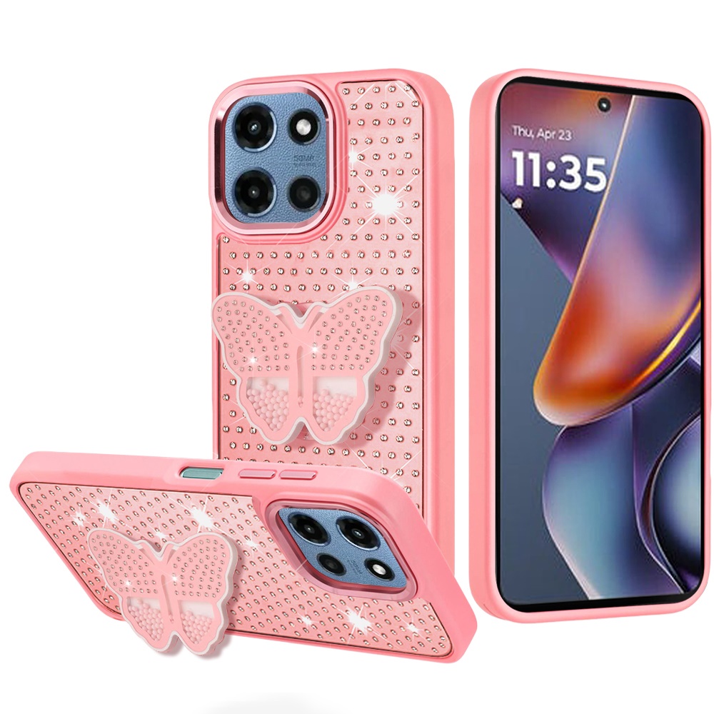 For Motorola Moto G 5G 2025 Butterfly Moveable Grip Stand With Small Diamonds Meta Buttons HQ Hybrid - Pink