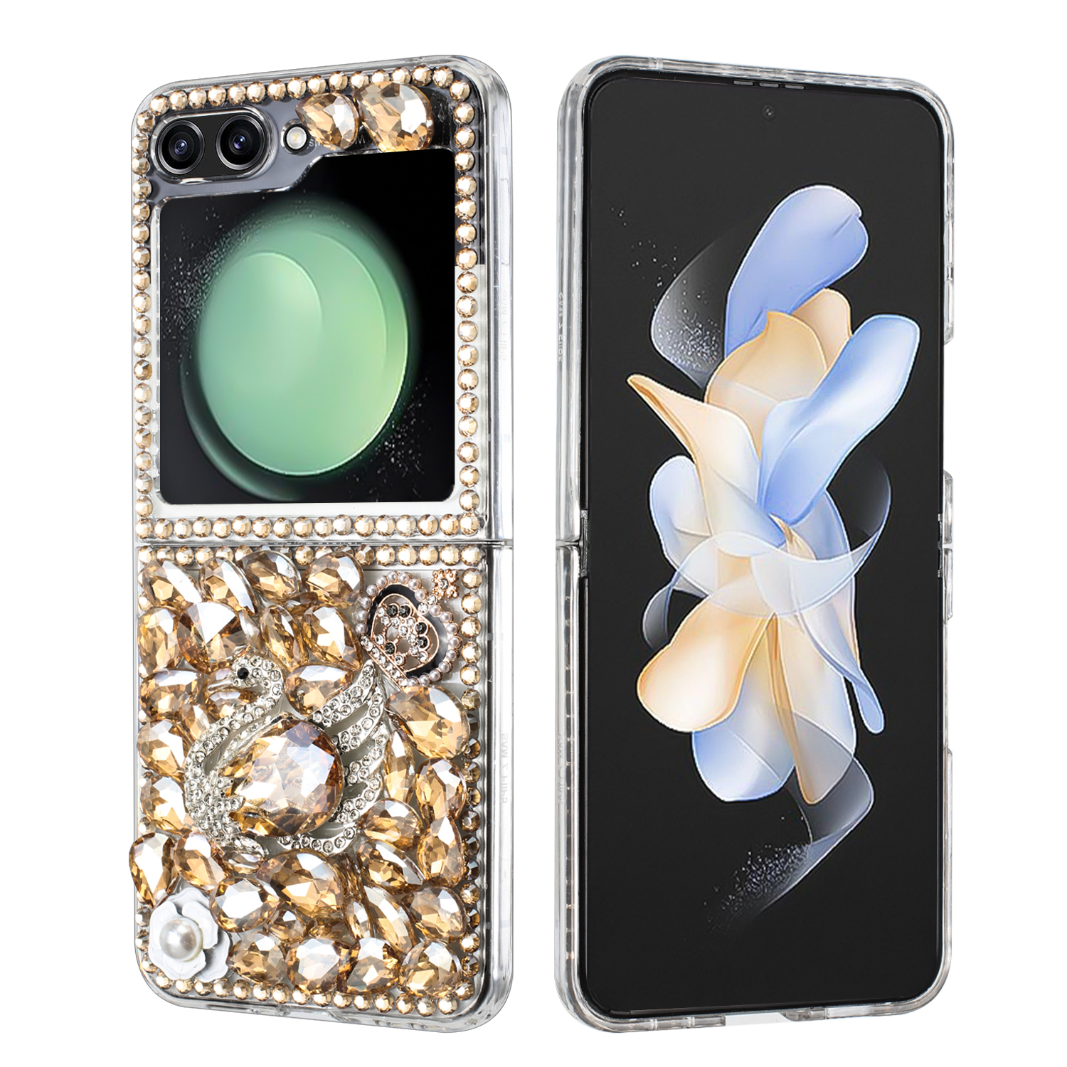 For Samsung Z Flip 6 Full Diamond with Ornaments Hard TPU Case Cover - Gold Swan Crown Pearl