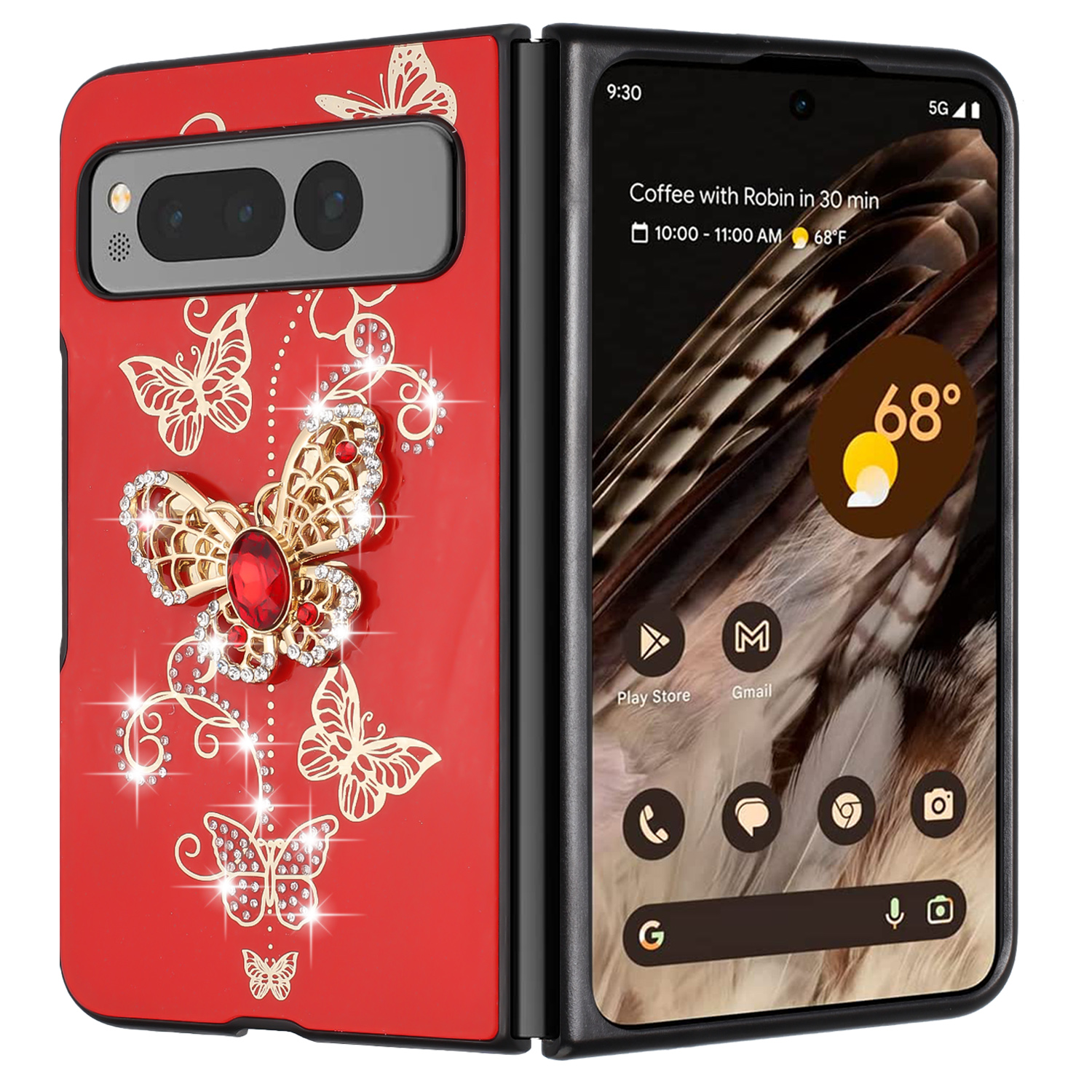 For Samsung Z Fold 6 SPLENDID Diamond Glitter Ornaments Engraving Case Cover - Garden Butterflies Red