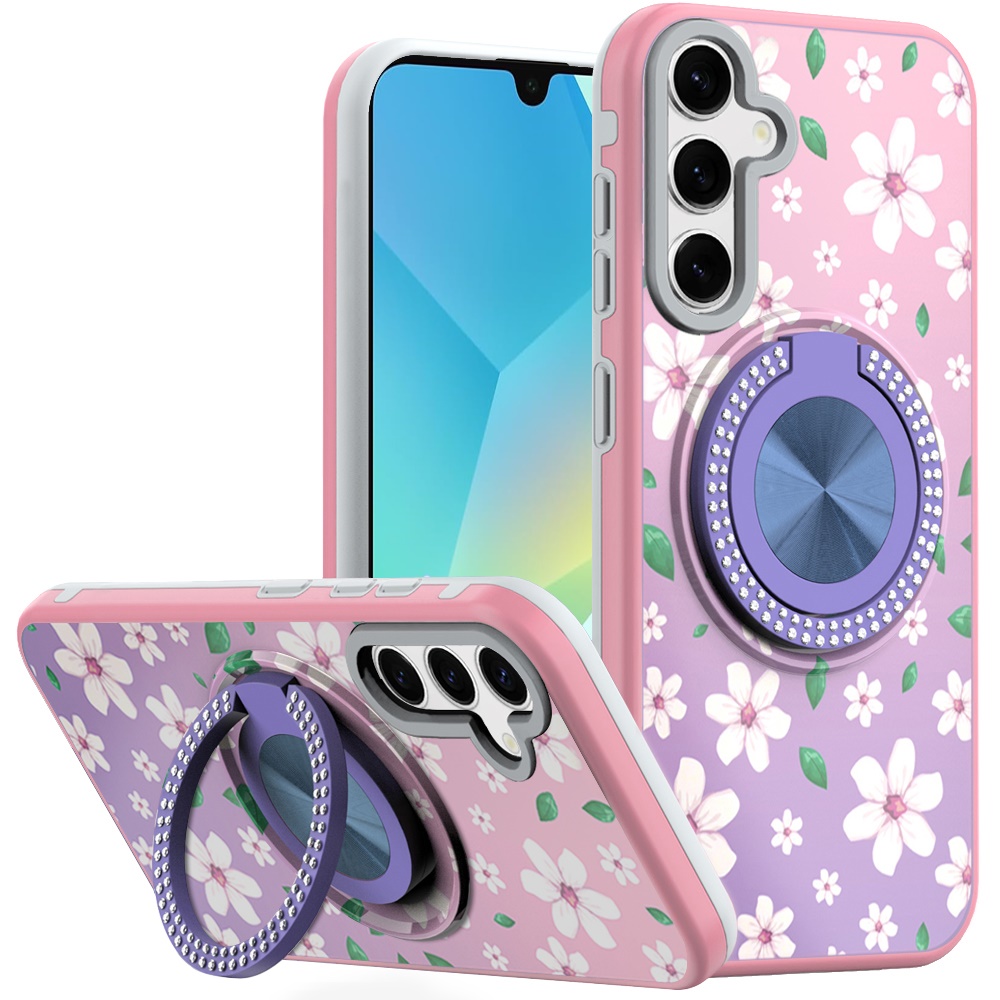 For Samsung A16 5G Metal Diamond CD Pattern Design Matte Finished Hybrid with Rotational Ring [Car Mount Friendly] Case - Floral B