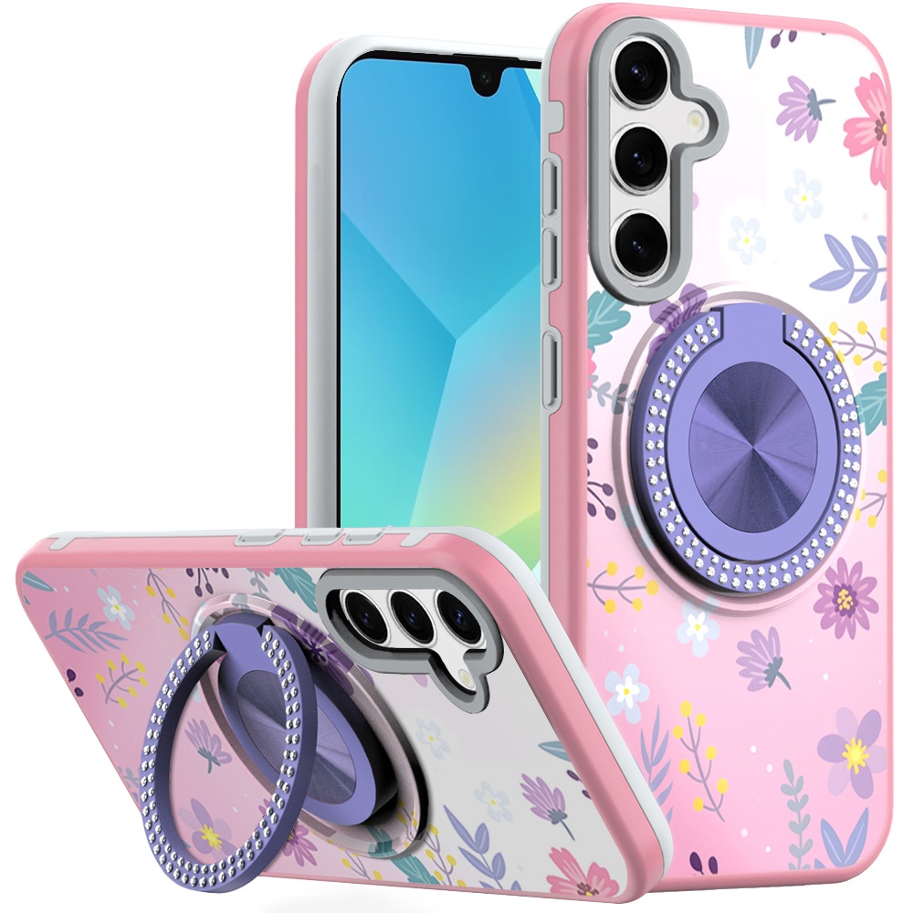 For Samsung A16 5G Metal Diamond CD Pattern Design Matte Finished Hybrid with Rotational Ring [Car Mount Friendly] Case - Floral C