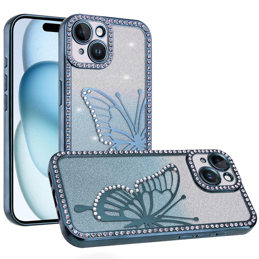 For iPhone 15 Electroplated Butterfly With Diamonds Glitter Shimmer Hybrid Case - Blue
