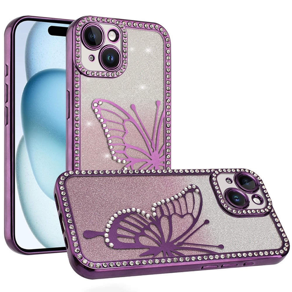 For iPhone 15 Electroplated Butterfly With Diamonds Glitter Shimmer Hybrid Case - Purple