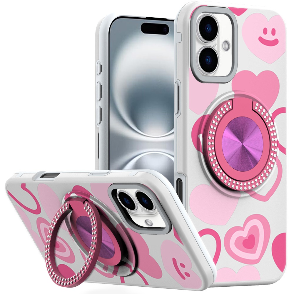 For iPhone 16 Plus 6.7 inch Metal Diamond CD Pattern Design Matte Finished Hybrid with Rotational Ring [Car Mount Friendly] Case - Hearts