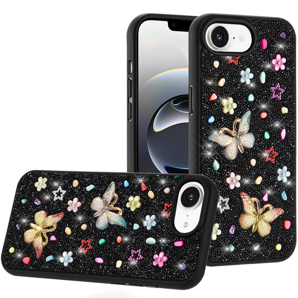For iPhone 16E (E edition) / SE4 (2025) Butterfly Ornaments Diamond Bling Glitter Hybrid Case - Black