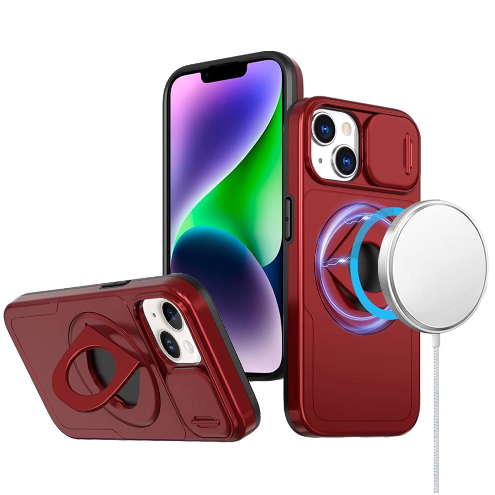 For iPhone 14/13 Trendy Full Coverage with Camera Window [Magnetic Circle] with Rotational Ring Stand Hybrid Case - Red
