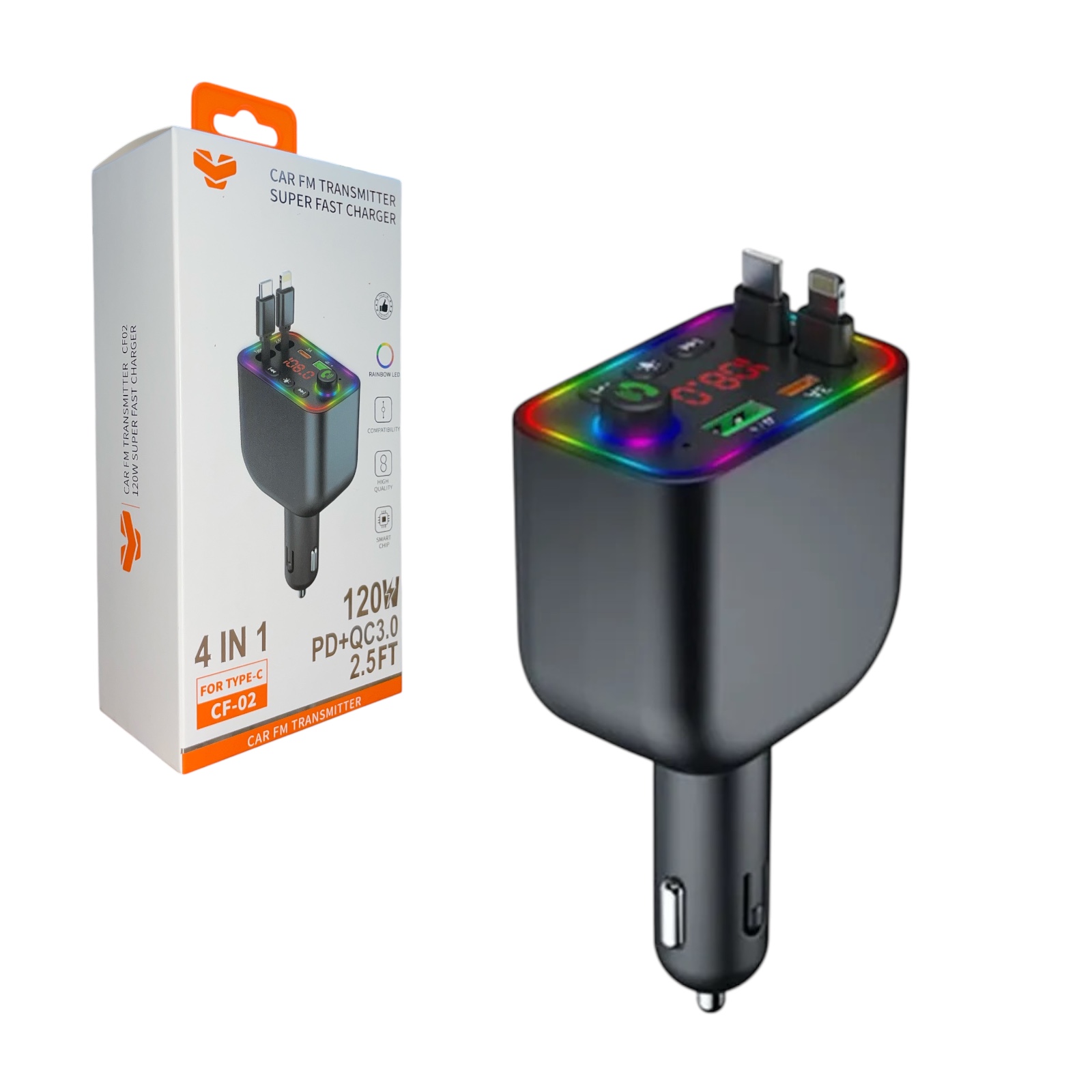 4 in 1 120W FM Transmitter with built in Type-c and Lightning Cable