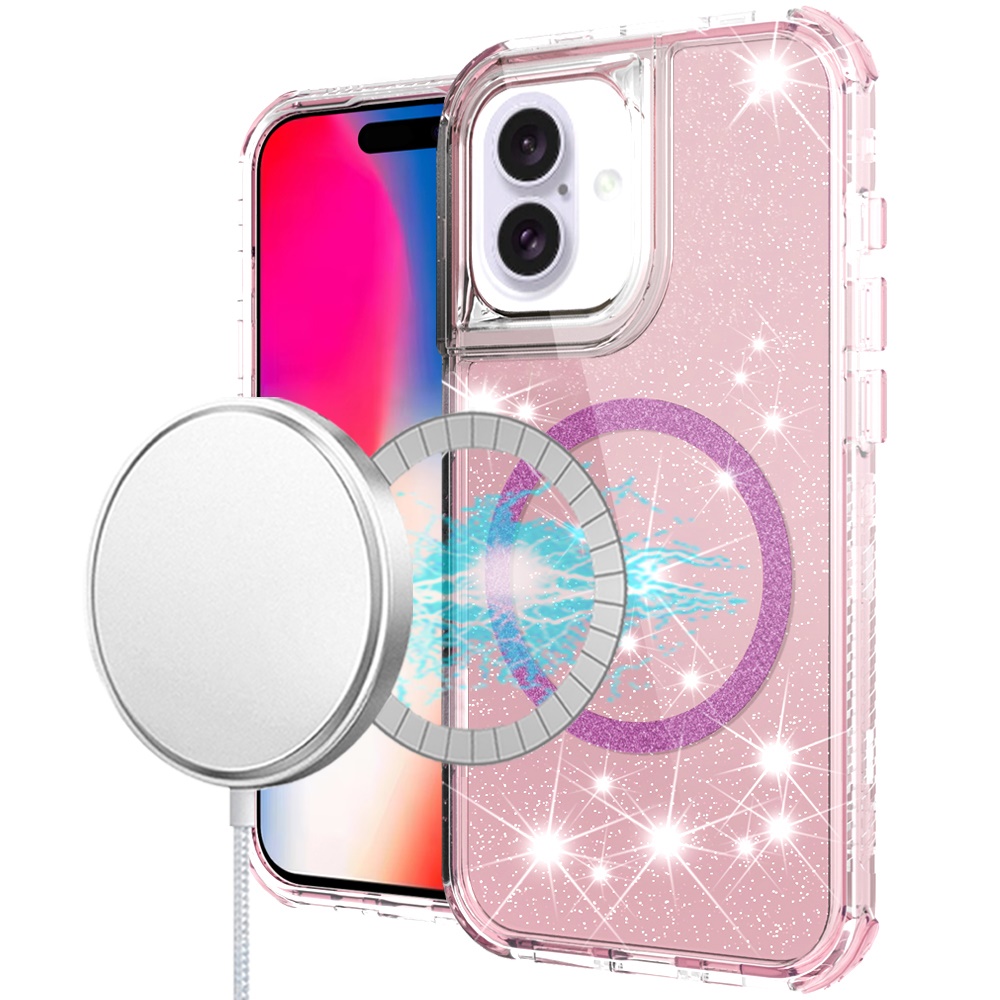 For iPhone 16 6.1 inch Magnetic Ring Glitter 3in1 Hybrid Case Cover - Pink