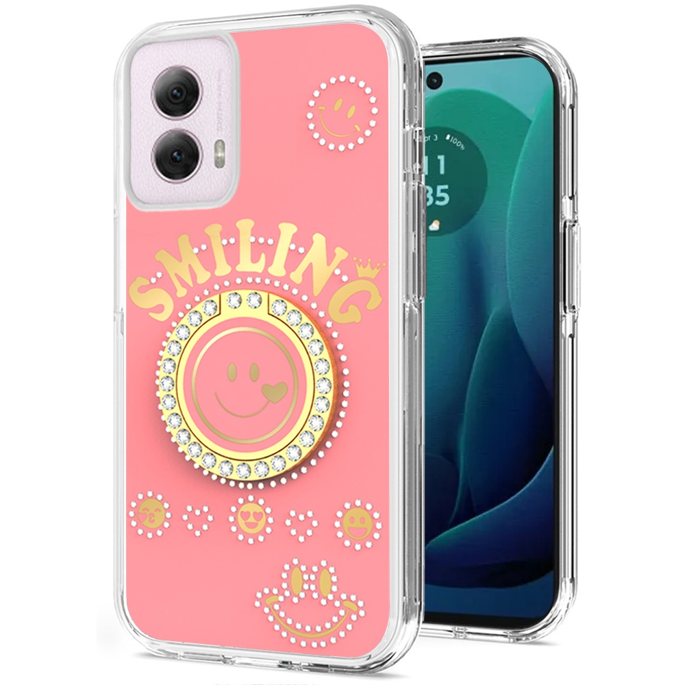 For Motorola Moto G 5G 2024 Smiling Glitter Ornament Bling With Ring Stand Hybrid Case Cover - Pink