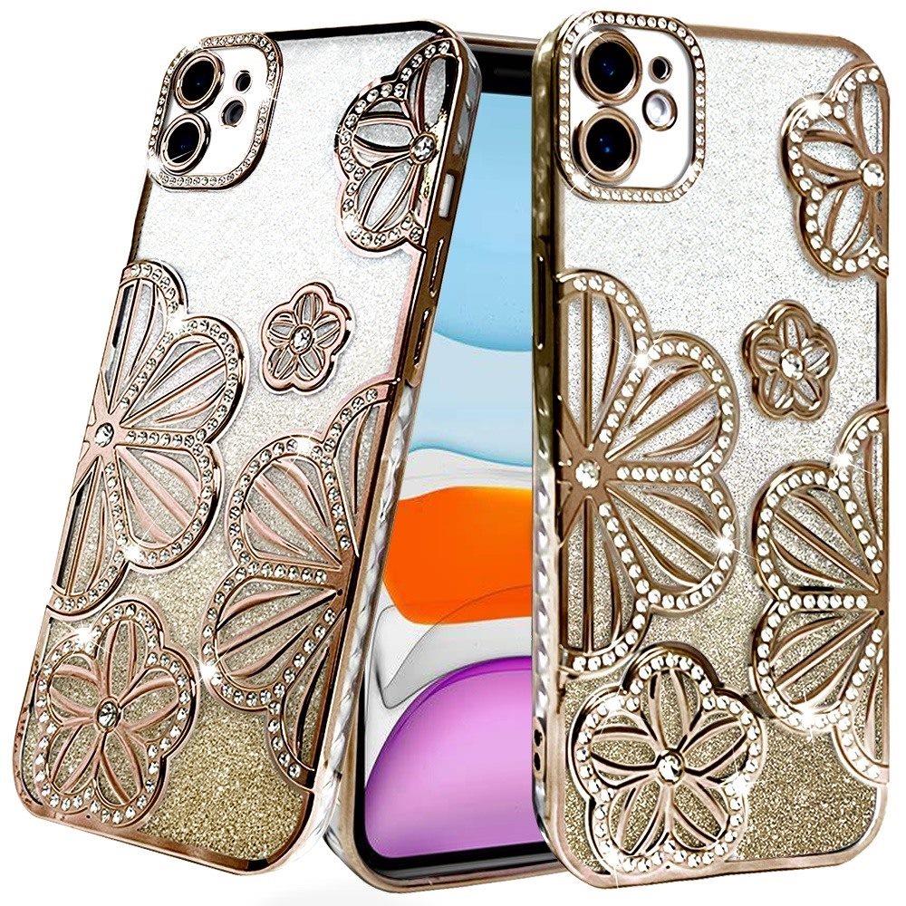 For iPhone 11 (XI6.1) Shimmer Glitter Floral Design Thick TPU Case Cover - Gold