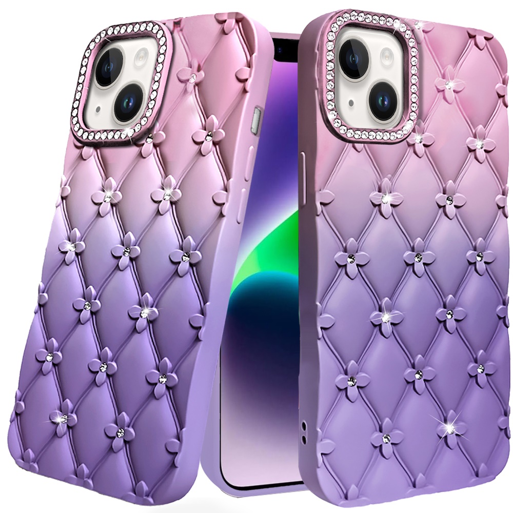 For iPhone 13/14 Floral Joy Glitter Shimmer Leather Feel Thick TPU Case - Light Pink/Light Purple