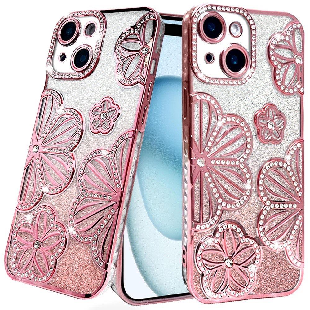 For iPhone 15 Shimmer Glitter Floral Design Thick TPU Case Cover - Rose Gold