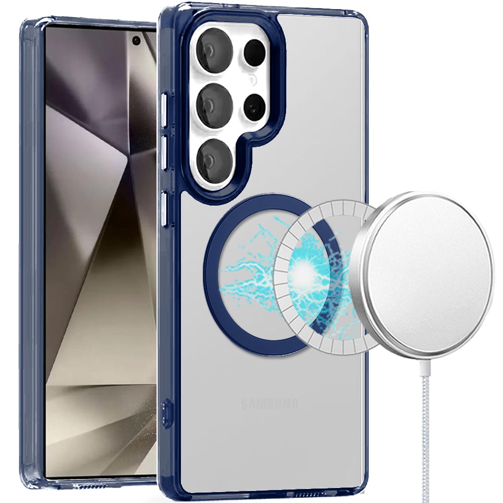 For Samsung Galaxy s25 Ultra Magnetic Circle Ring Transparent Premium Acrylic with Metal Buttons & Camera Raised Lip - Blue