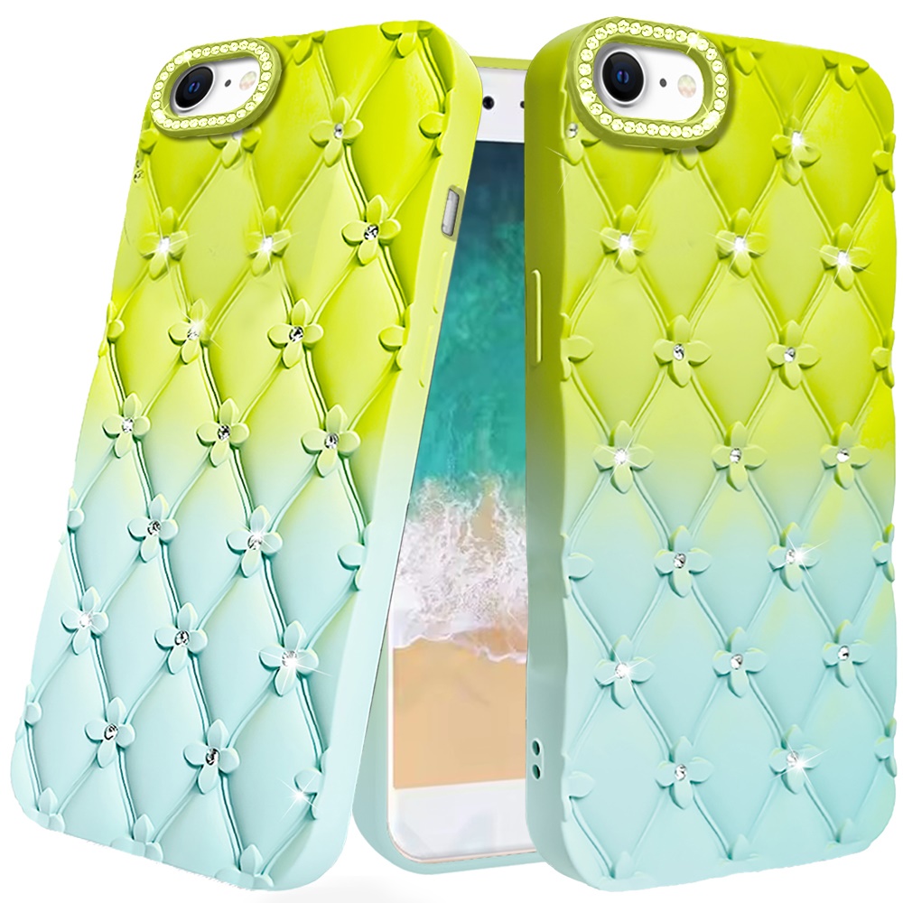 For iPhone SE4 Floral Joy Glitter Shimmer Leather Feel Thick TPU Case - Light Green/Teal