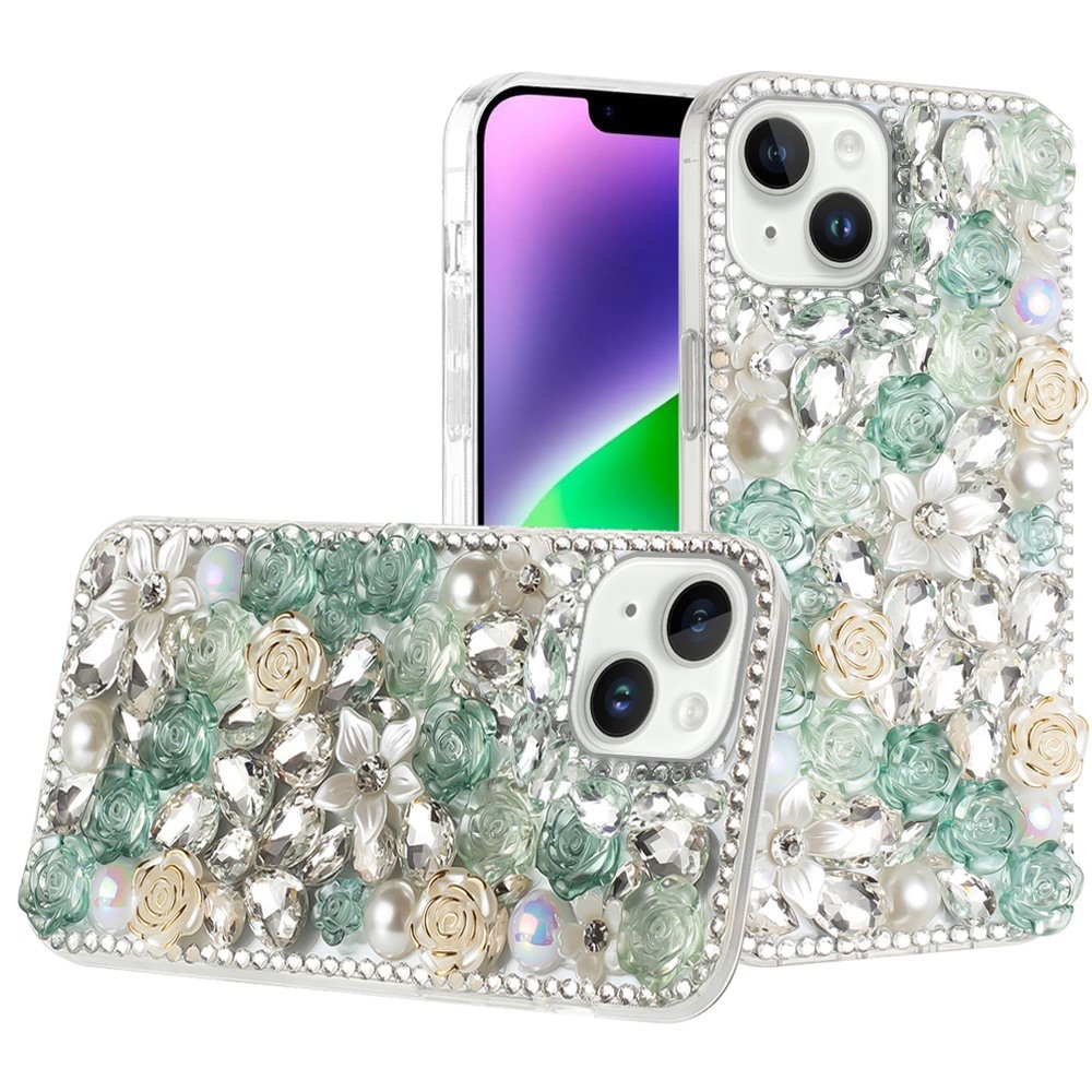For iPhone 14 6.1" Rose Flower Full Diamond Bling Stones - Green