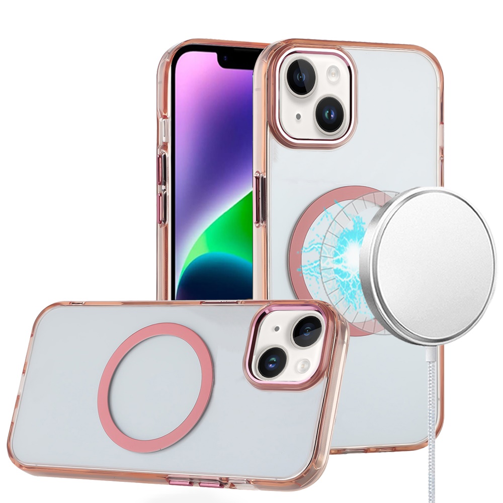 For iPhone 13 6.1 Magnetic Circle Ring Transparent Premium Acrylic with Metal Buttons & Camera Raised Lip - Rose Gold
