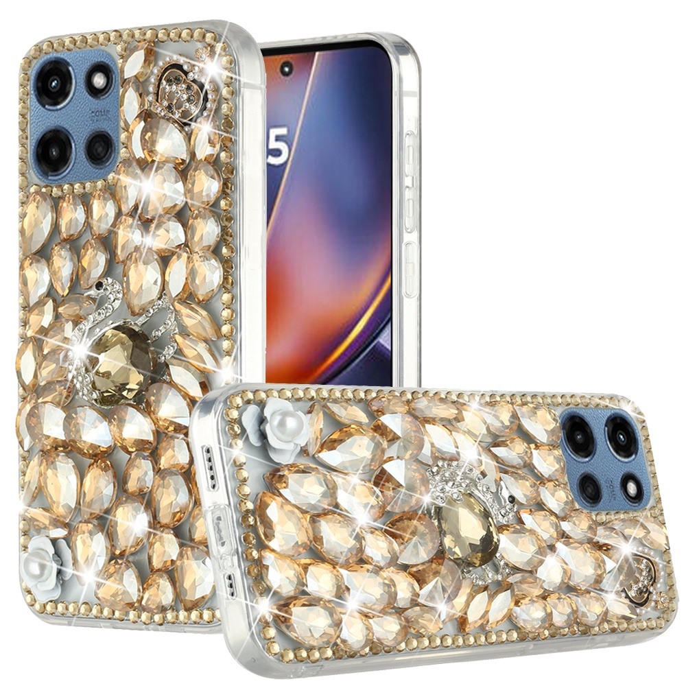 For Motorola Moto G 5G 2025 Full Diamond with Ornaments Hard TPU Case Cover - Gold Swan Crown Pearl