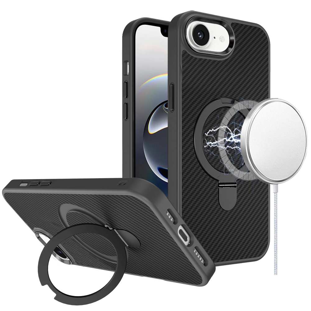 For iPhone 16E (E edition) / SE4 (2025) Carbon Design [Magnetic Circle] with Ring Stand Hybrid Case - Black