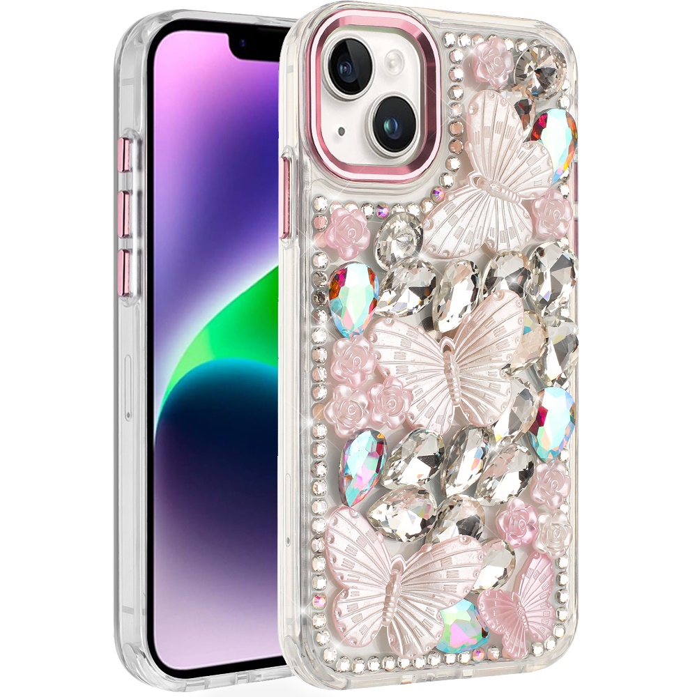 For iPhone 13/14 Lavished Floral Butterfly Bling Stones Hybrid Case - Pink