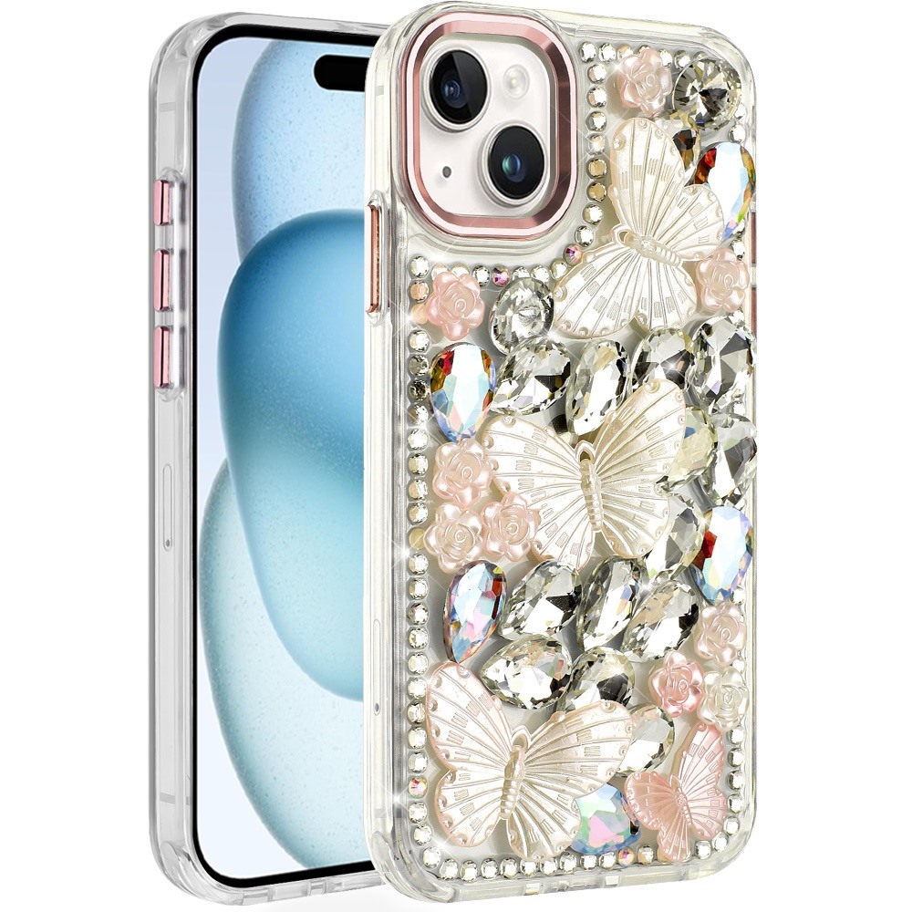 For iPhone 15 Lavished Floral Butterfly Bling Stones Hybrid Case - Rose Gold