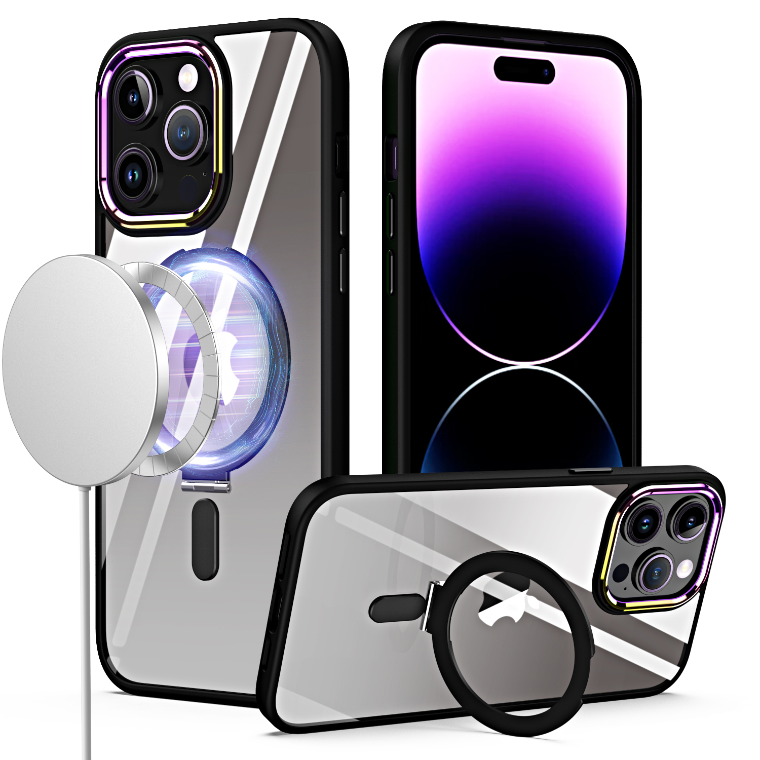 For iPhone 15 Dazzle [Magnetic Circle] Kickstand Alloy Chrome Transparent Hybrid - Black