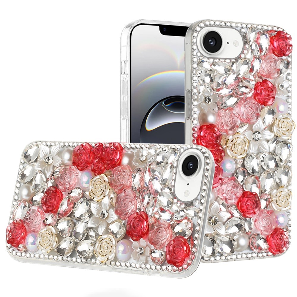For iPhone 16E / SE4 Rose Flower Full Diamond Bling Stones - Red
