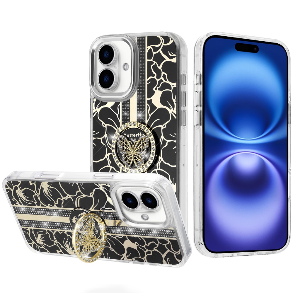 For iPhone 17 Splendid Floral Designs with Metal Camera and Buttons with Butterfly Ring Stand Hybrid Case - Black