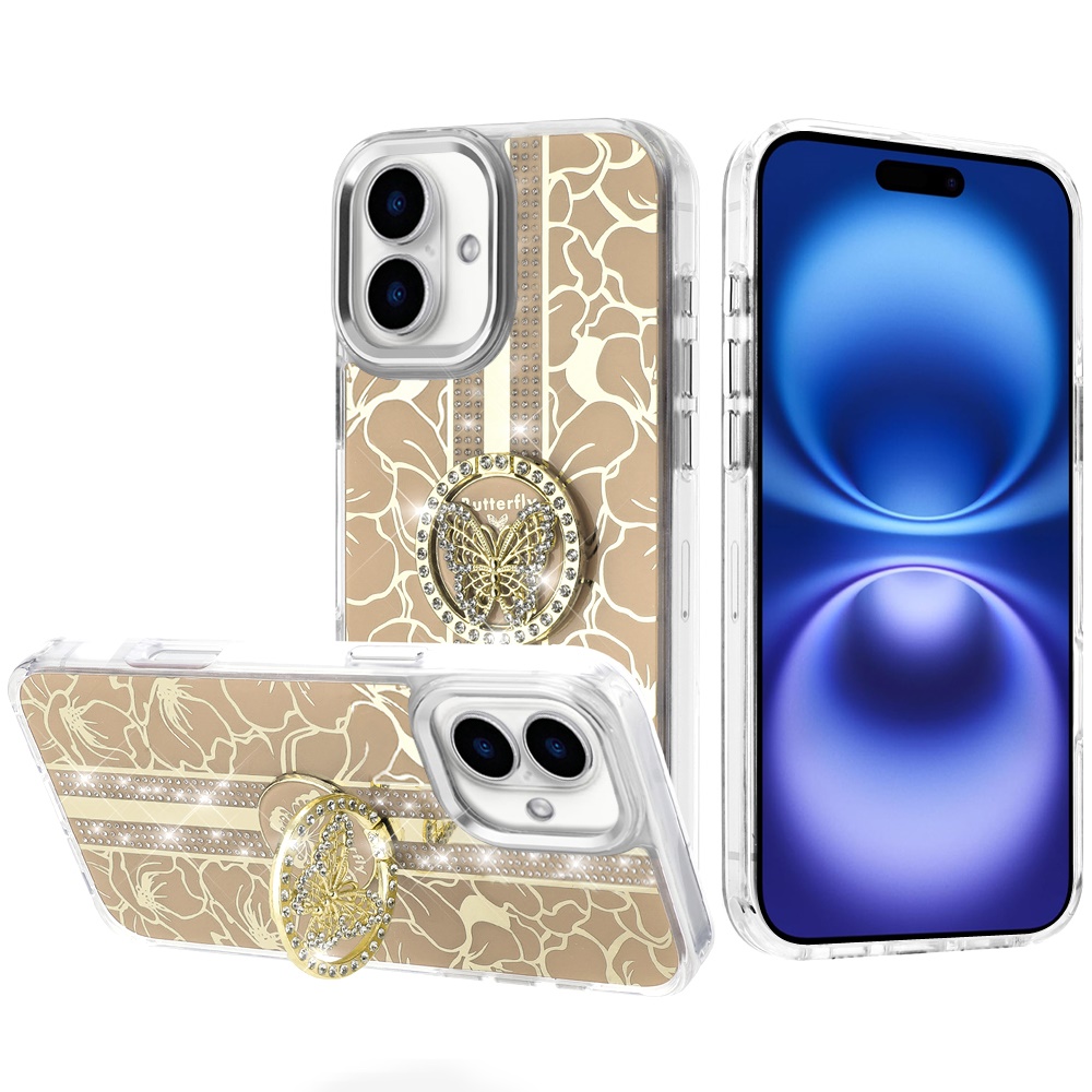 For iPhone 17 Splendid Floral Designs with Metal Camera and Buttons with Butterfly Ring Stand Hybrid Case - Gold