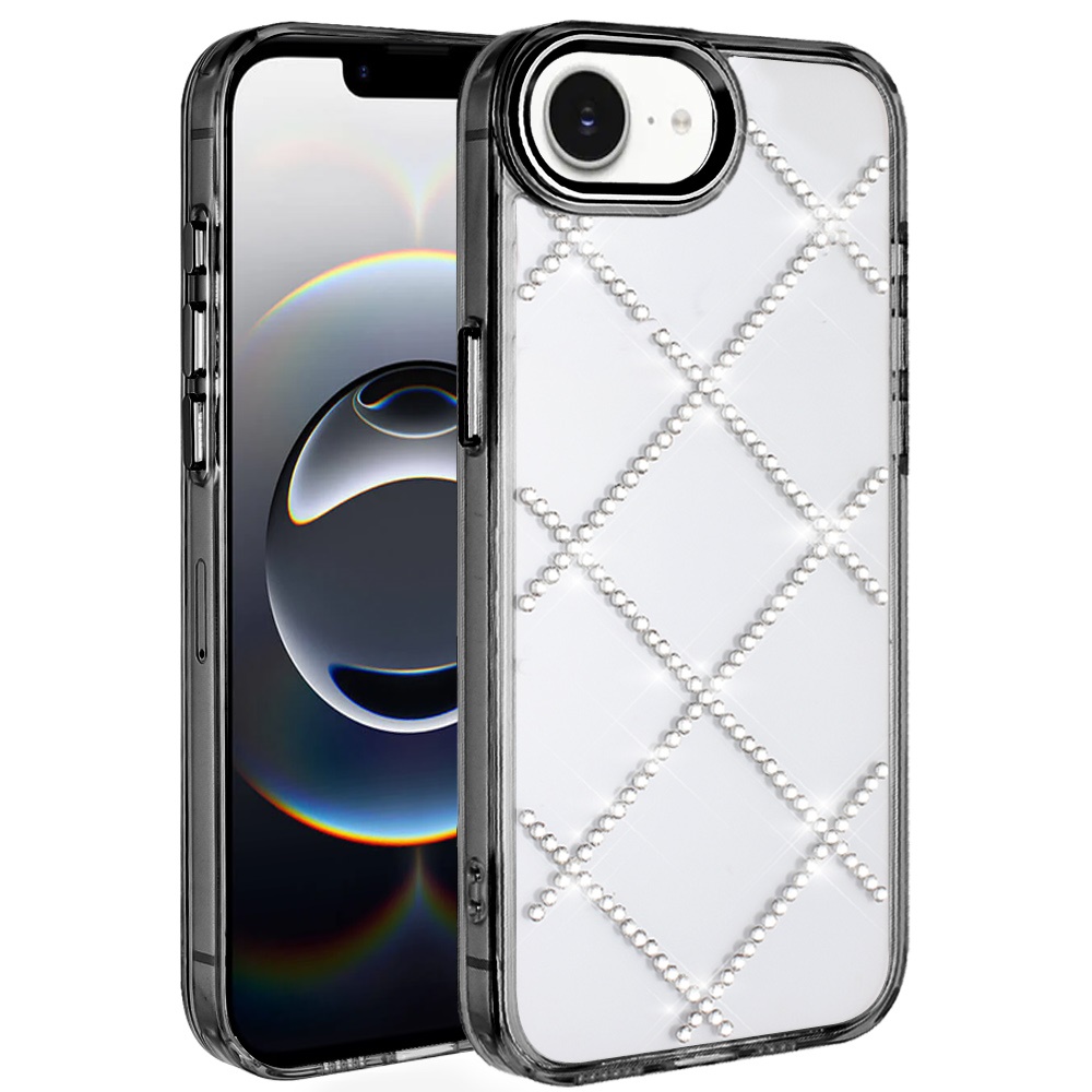For iPhone 16E (E edition) / SE4 (2025) Gem Glitter Diamond Transparent Hard Colorful TPU Hybrid Case - Black