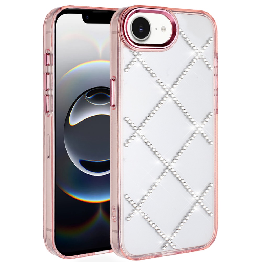 For iPhone 16E (E edition) / SE4 (2025) Gem Glitter Diamond Transparent Hard Colorful TPU Hybrid Case - Rose Gold