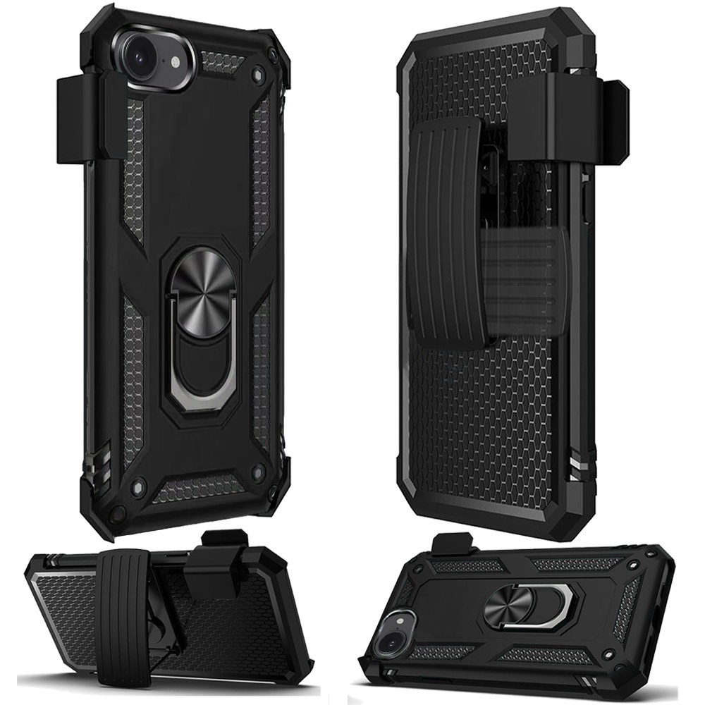 For iPhone 16E / SE4 Holster Magnetic Ringstand Clip Cover Case - Black