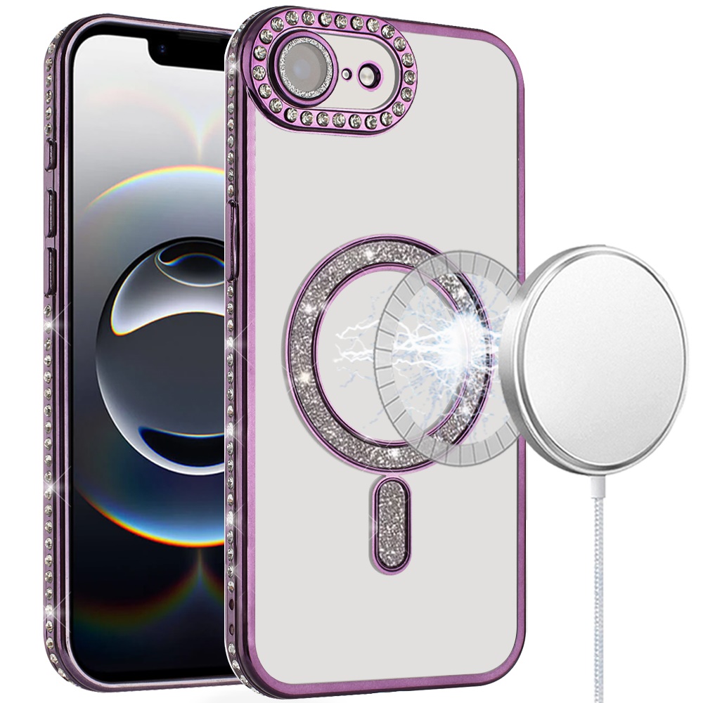 For iPhone 16E (E edition) / SE4 (2025) Glitter Magnetic Circle All-Around Diamond Thick TPU with Camera Protection - Purple