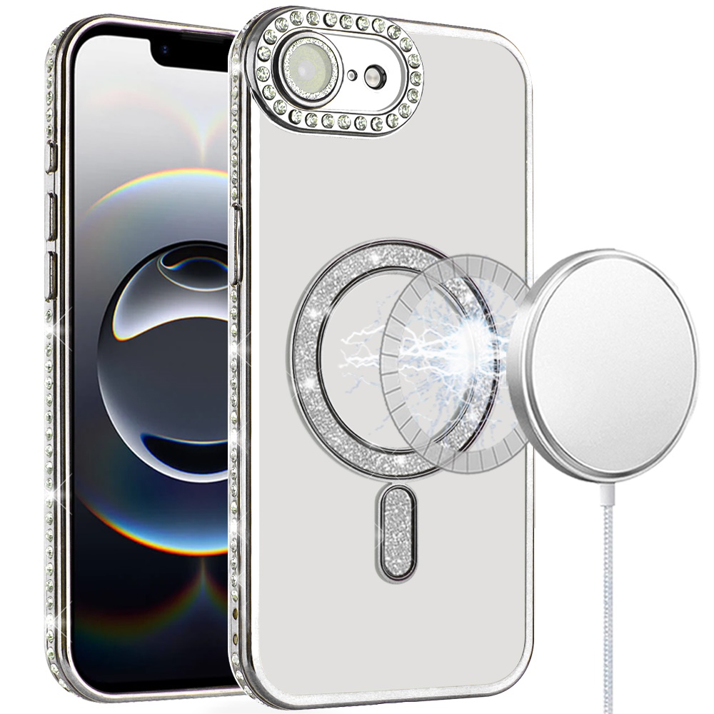 For iPhone 16E (E edition) / SE4 (2025) Glitter Magnetic Circle All-Around Diamond Thick TPU with Camera Protection - Silver