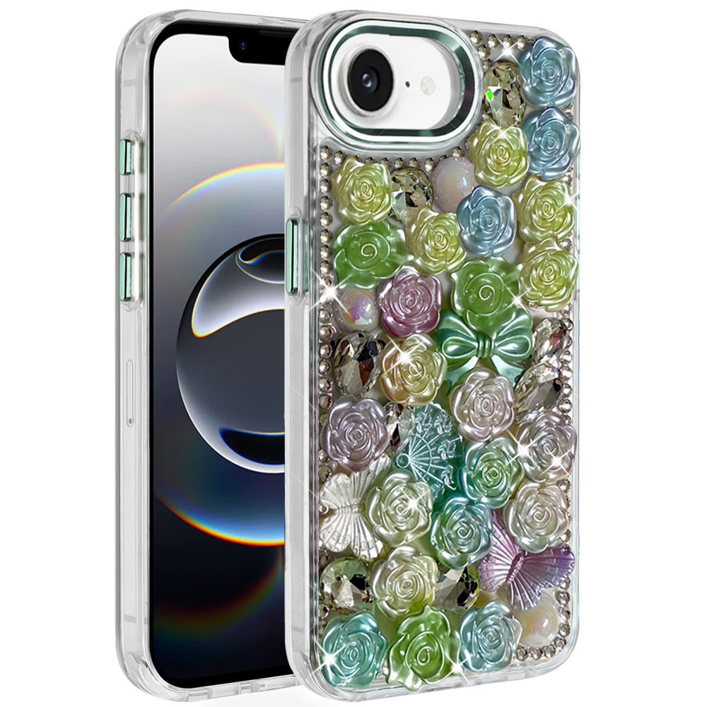 For iPhone 16E (E edition) / SE4 (2025) Muti-Color Floral Bling Stones Ornaments Case - Green