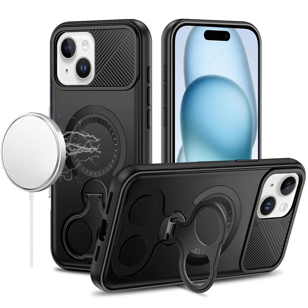 For iPhone 15 Car Mount with 2-Ring Stand Hybrid Case - Black