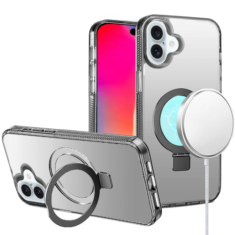For iPhone 16 6.1 inch Dotted Edged Line Transparent HQ Magnetic Ring Stand Hybrid - Black