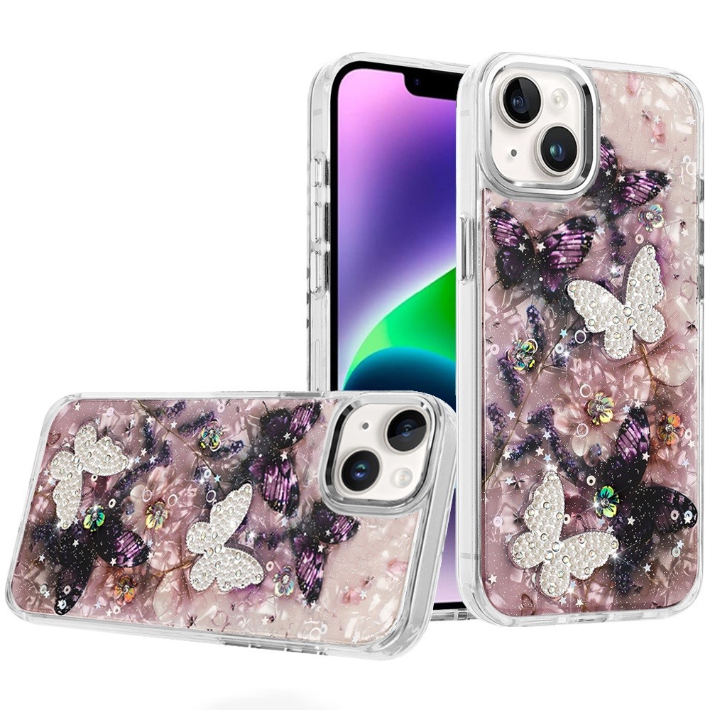 For iPhone 13/14 Epoxy Glitter Butterfly Ornaments Design HQ Metal Buttons Hybrid - 5
