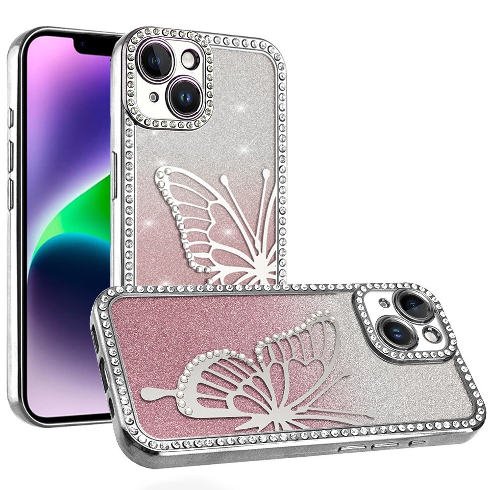 For iPhone 13/14 Electroplated Butterfly With Diamonds Glitter Shimmer Hybr