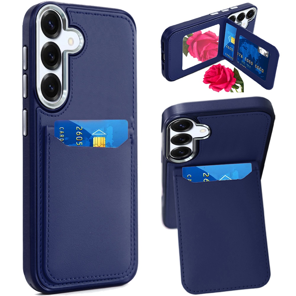 For Samsung s26 Plus Card Holder with Mirror Inside PU Leather Hybrid Case - Dark Blue