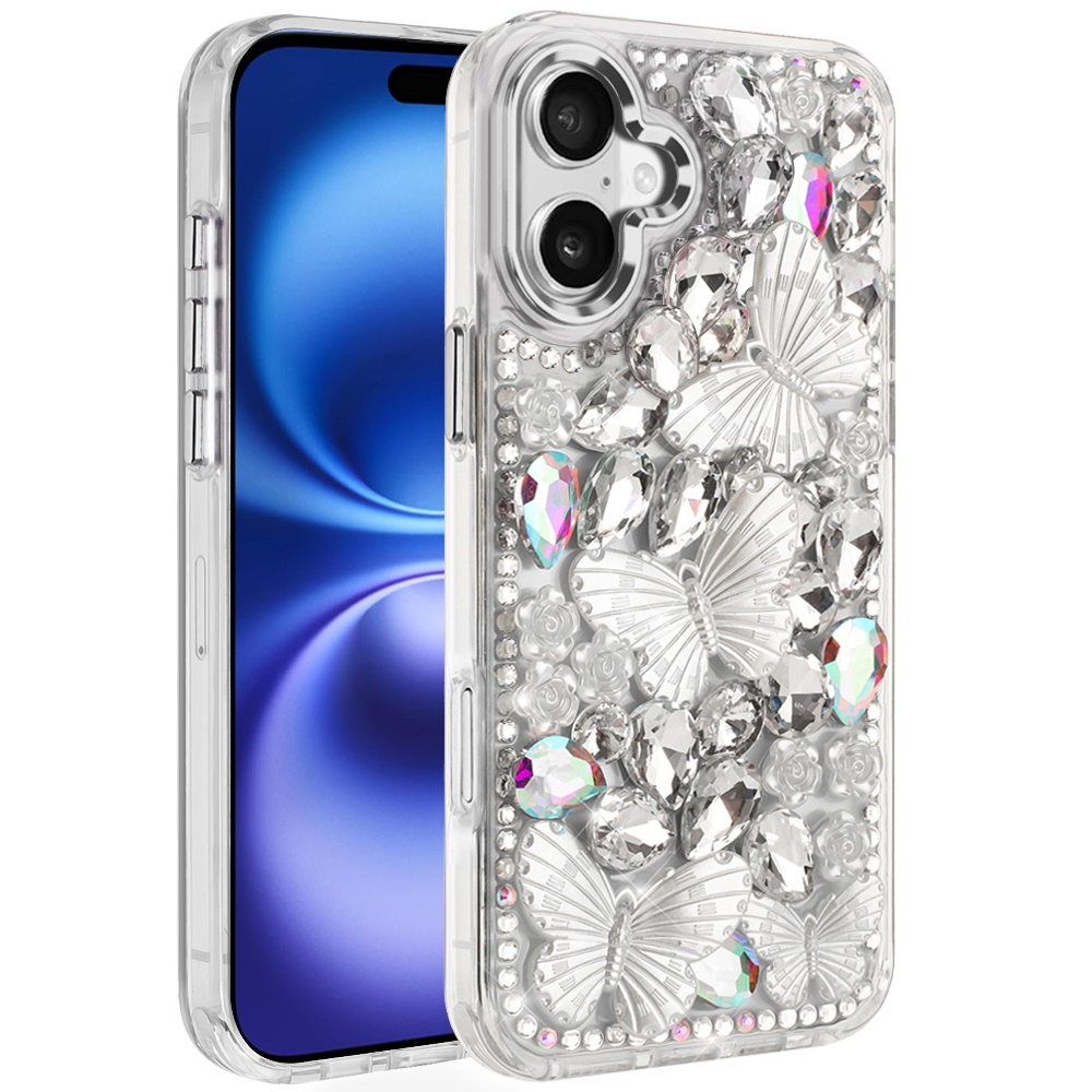 For iPhone 17 Lavished Floral Butterfly Bling Stones Hybrid Case - Silver