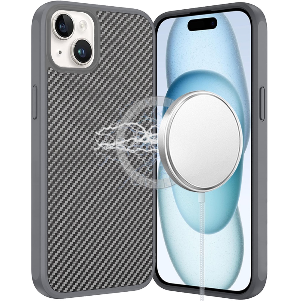 For iPhone 15 CarbonFiber Design Magnetic Ring HQ Thick 2.0mm Hybrid Case - Grey