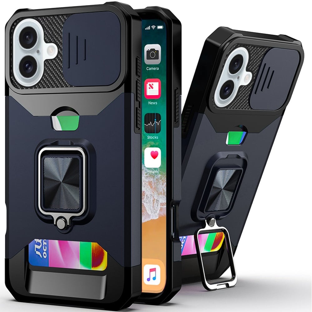 For iPhone 16 Plus 6.7 inch Multi-Functional Card Magnetic Ring Stand Hybrid Camera Case Cover - Blue