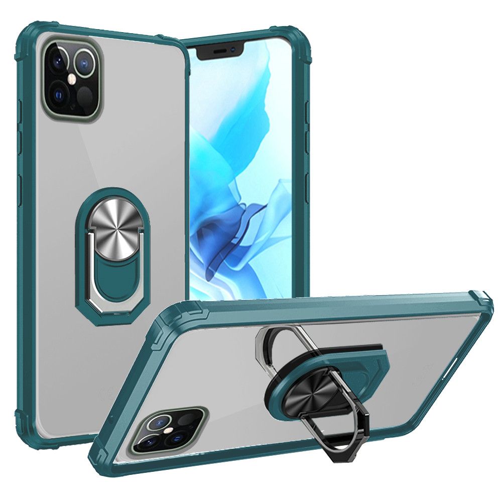For iPhone 12/12 Pro Transparent Magnetic Ring Kickstand Case Cover - Clear/Midnight Green