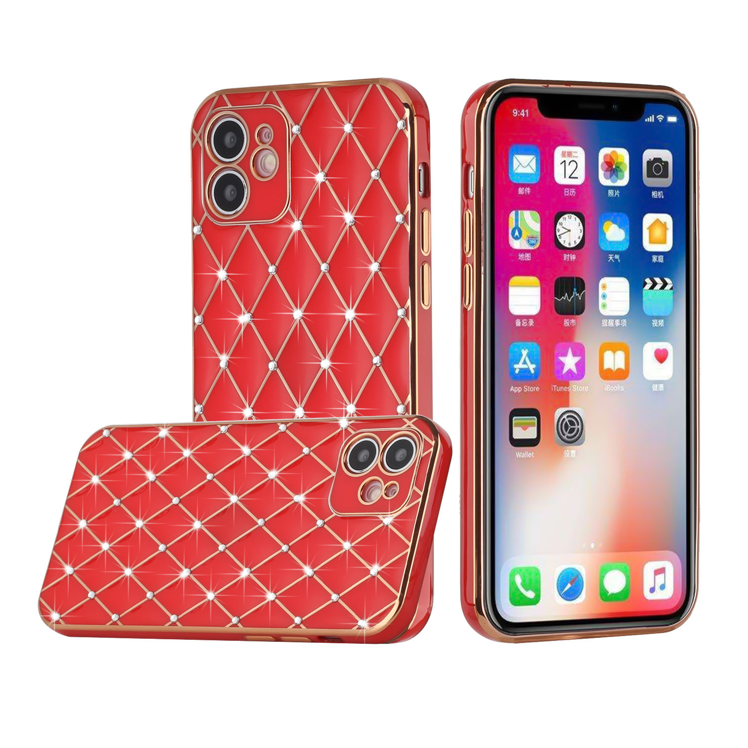 For Apple iPhone 14 6.1" Diamonds on Electroplated Grid Design TPU Case Cover - Red