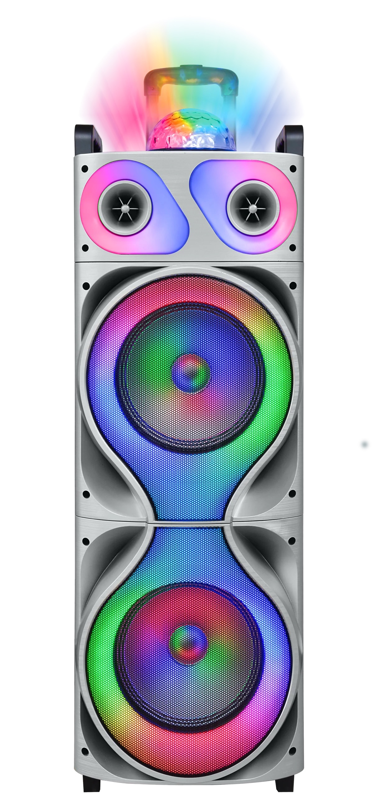 MAXPOWER 10" X 2 DJ Woofer with Disco Ball, Rechargeable Battery - SILVER Bluetooth, SD, USB,AM/FM, Wired MIC