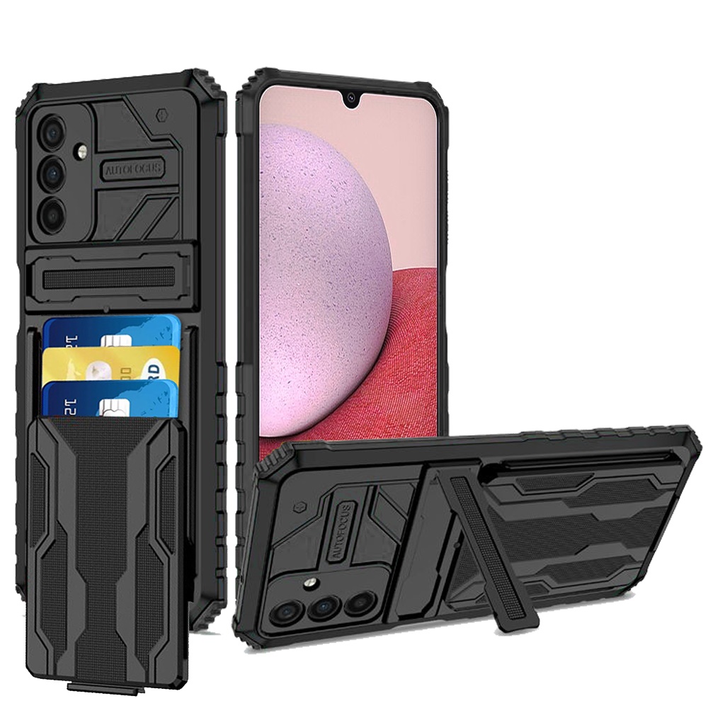 For Samsung A14 5G Multiple Card Holder Kickstand Hybrid Case Cover - Black