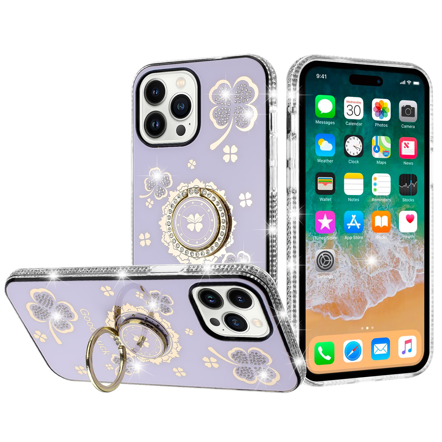 For iP15 Pro Max Splendid Glitter with Diamonds All Around Edges Ring Stand Case Cover - Purple