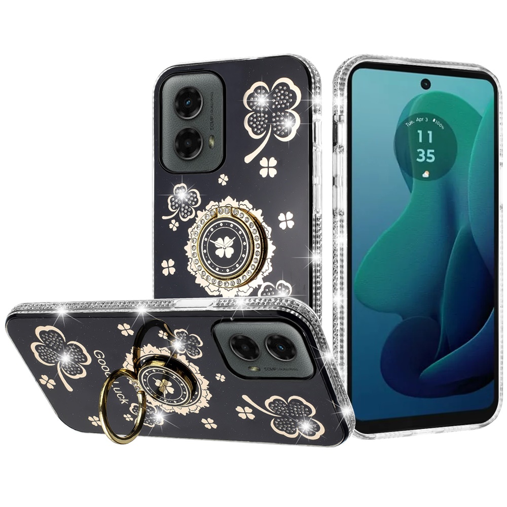 For Motorola Moto G 5G 2024 Splendid Glitter with Diamonds All Around Edges Ring Stand Case Cover - Black