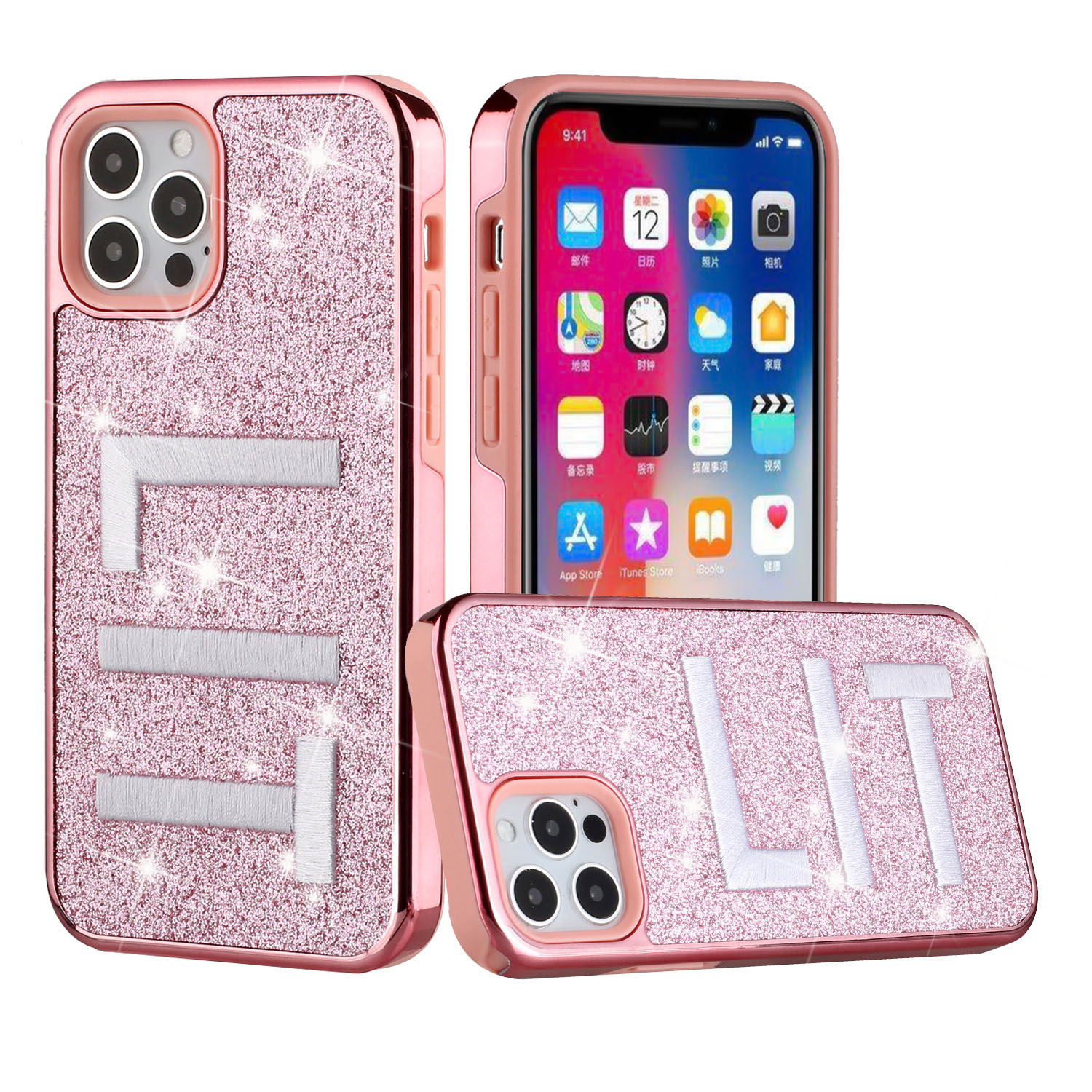 For iPhone 12 & iPhone 12 Pro (Open Camera Hole) Embroidery Bling Glitter Chrome Hybrid Case Cover - LIT on Pink