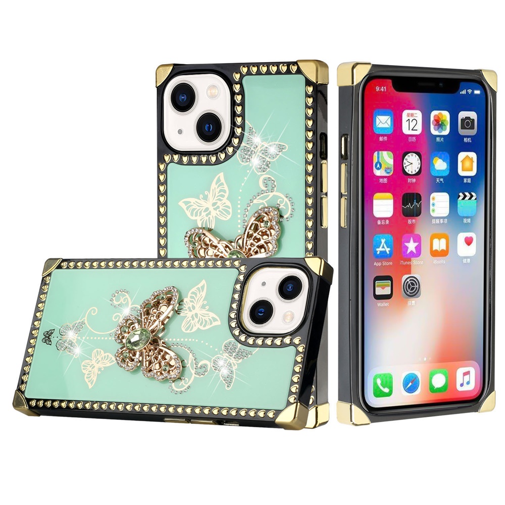 For Apple iPhone 11 (XI6.1) Passion Square Hearts Diamond Glitter Ornaments Engraving Case Cover - Garden Butterflies Teal